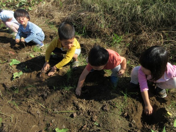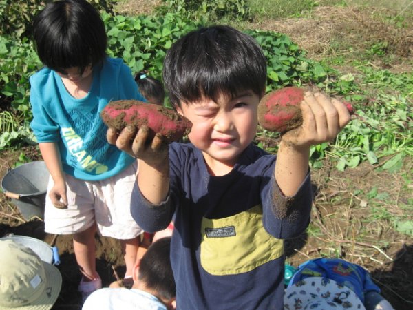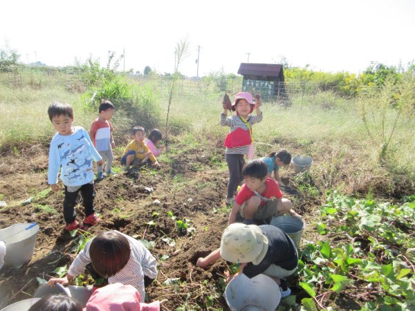 晴天の中、芋ほりを楽しみました。大きいサツマイモにみんなびっくり!