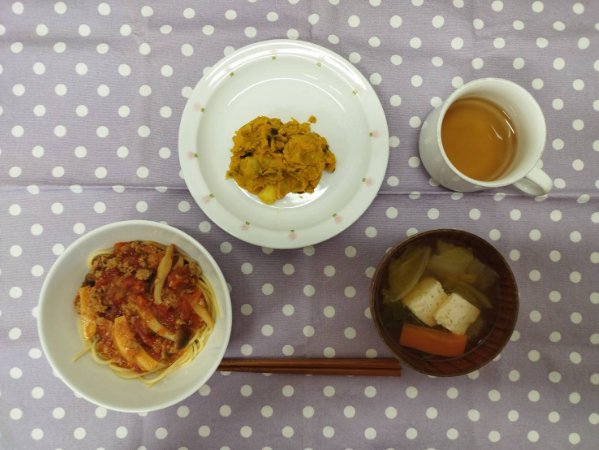 ▼11/21(金)きのこミートスパゲティー、かぼちゃとさつまいものサラダ