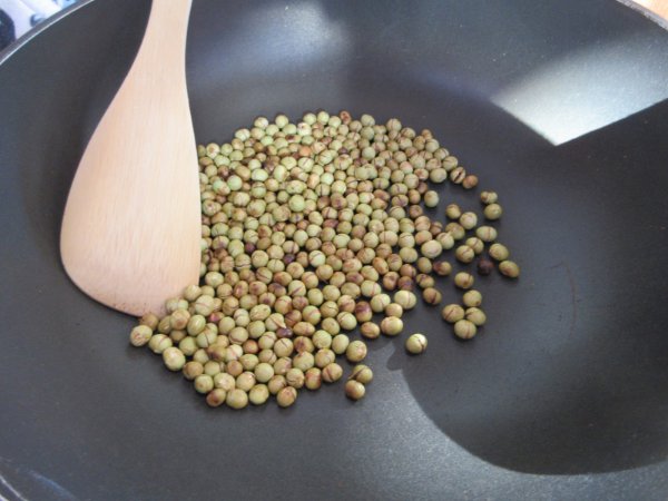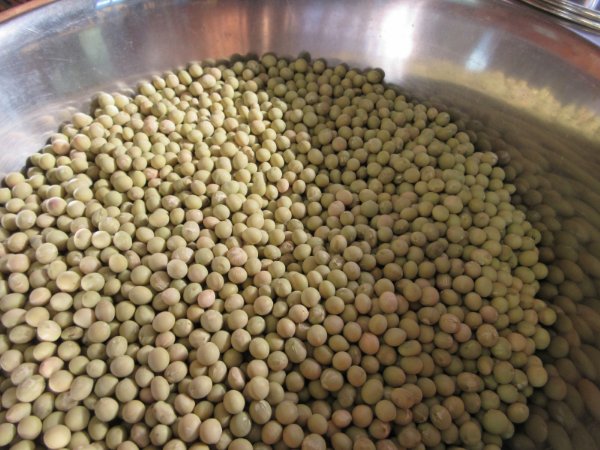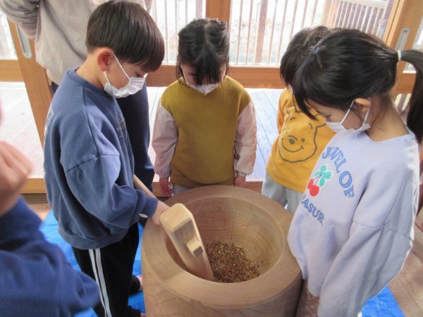 炒った香ばしい大豆をうすやすり鉢でつぶします。餅つきできな粉餅に使います。