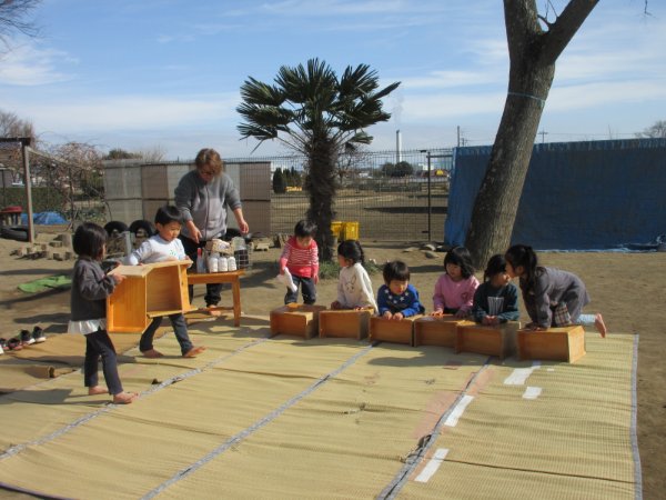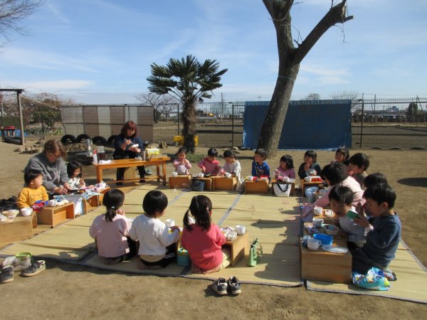 今日はお弁当の日。やまねこ・とんび組の子どもたちは暖かい園庭でお弁当を食べました。