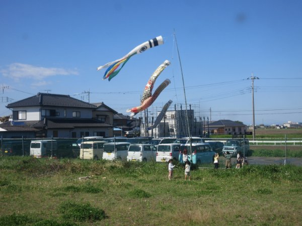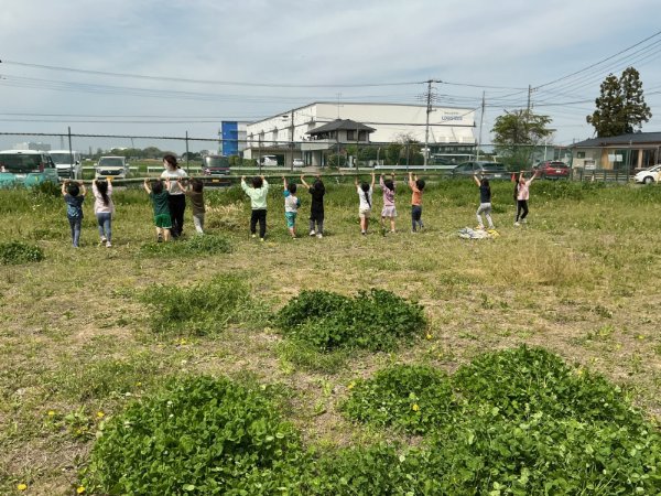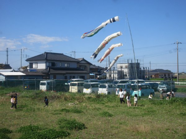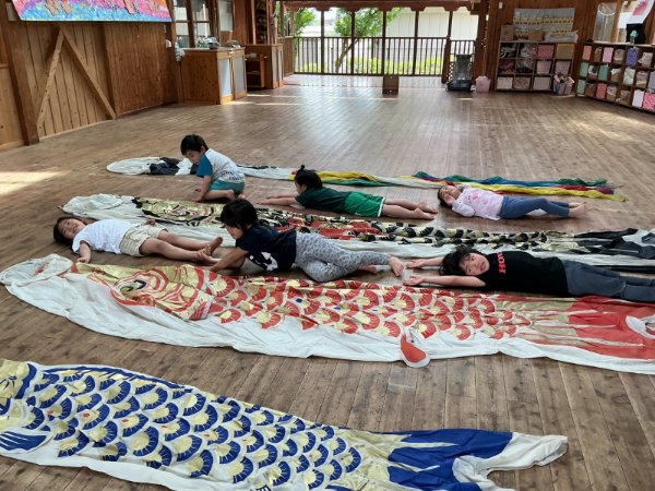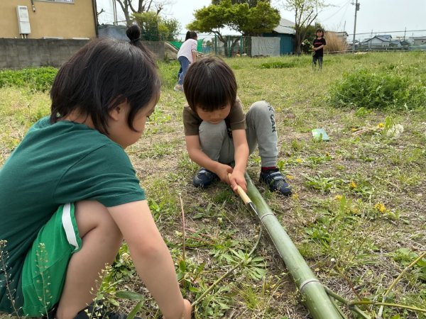 年長さんが竹をみんなで運び、鯉のぼりをあげました。